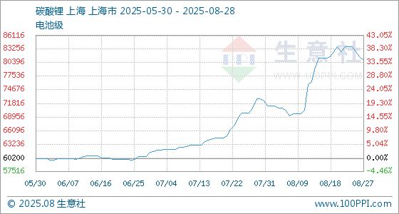 8月28日,生意社碳酸锂(电池级)基准价为80966.67元/吨,与本月初(72333.33元/吨)相比,上涨了11.94%。