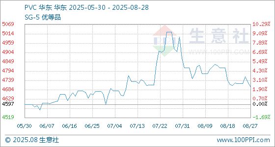 8月28日,生意社PVC基准价为4699.00元/吨,与本月初(4869.00元/吨)相比,下降了3.49%。