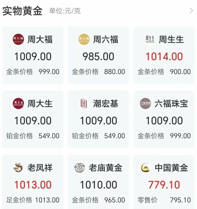 实物黄金方面,国内多数品牌黄金首饰克价已突破1000元/克。
