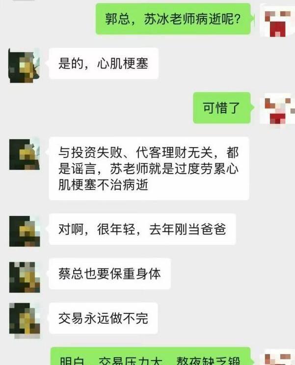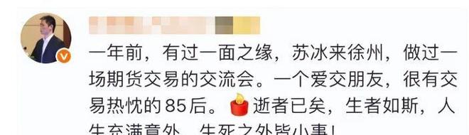 在阅读此文之前,麻烦您点击一下“关注”,既方便您进行讨论和分享,又能给您带来不一样的参与感,感谢您的支持! “一入期门深似海,从此亲人是陌路”。 这原本是期货圈内部流传的玩笑话,没想到竟在苏冰身上变成了现实。 据官方消息,苏冰因突发心肌梗塞去世,年仅40岁。他因惊人的投资回报率被业内尊称为“草根战神”。