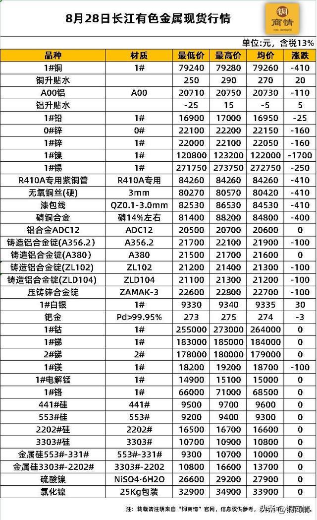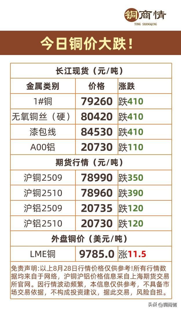 8月28日,沪铜主力合约(2509)收报79260元/吨,单日下跌410元/吨,延续近期弱势格局。多重因素叠加压制市场情绪:中国国家统计局数据显示,1-7月全国规模以上工业企业利润总额40203.5亿元,同比下降1.7%,虽营业收入同比增长2.3%,但成本压力凸显,企业盈利空间持续收窄。 全球显性库存激增成为另一大利空。伦敦期铜(LME)库存自6月底以来飙升72%至156100吨,美国COMEX库存年内更是增长近两倍,创下2020年以来新高。供需失衡加剧市场担忧,周三Comex期铜下跌1.4%至每磅4.40美元,较LME铜贴水扩大至每吨62美元。 Marex高级策略师Alastair Munro指出,当前金属价格在美元走强与宏观经济疲软的双重压力下已展现韧性。尽管短期库存压力显著,但中国稳增长政策预期与新能源用铜需求仍为市场提供底部支撑,后市需关注美联储降息节奏及国内工业品去库进程。 铜铝今日最新行情: 注:以上信息仅供参考使用,不作为其他用途,据此入市,风险自担。 |