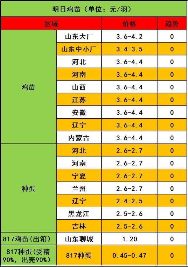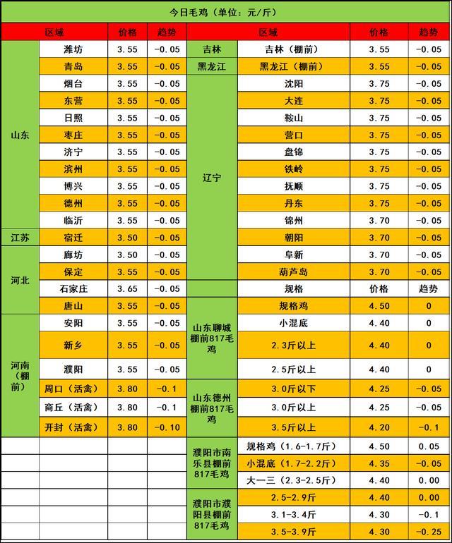 2025年8月29日家禽价格行情: 微评:鸡苗报价稳定。种禽企业预排计划为主,散户空棚率高,养殖端对鸡苗成本呈现明显抵触情绪,短期内苗价仍维持强势。 注:鸡苗报价混乱,大小厂鸡苗价格差异巨大,实际价格根据产品行情、消费、鸡苗出孵现状分析,预计近期鸡苗价格呈稳定为主。(种蛋报价稳定)。 温馨提示:以上所报817鸡苗、种蛋价格因地点以及采集点不同,可能存在一些差异,比本报价高或低均属正常,本报价仅供参考,请以当地实际成交为主。 微评:大肉食毛鸡报价下跌。冻品市场表现欠佳,屠企开工意愿不足,叠加鸡源近期出栏增多,供需双向支撑移位。短期或维持博弈拉锯趋势。 注:各地毛鸡以实际成交为准,其中活禽交易价格差异大。实际局部根据产品行情、消费、毛鸡出栏现状分析,实际收购价格与报价有一定差距,价格只供参考。 #养鸡# #鸡价# |