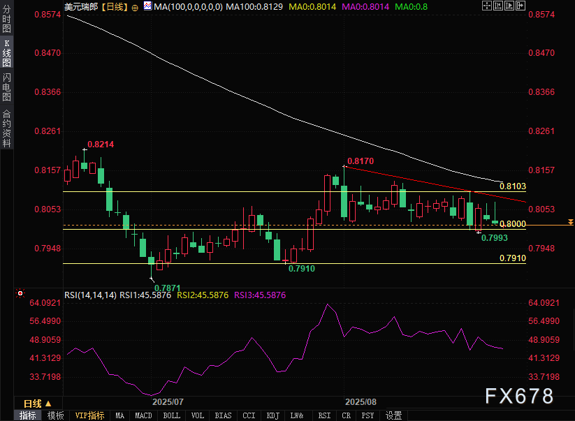 美元兑瑞郎周四(8月28日)欧市时段在0.8000心理关口附近获得支撑,现于0.8015附近窄幅震荡,此前该货币对连续三次均未冲破0.8075,而后从周三0.8075的高点回落,尽管周四公布的瑞士经济数据疲软,但短期看跌趋势仍未改变。 ![]() 此外,衡量瑞士未来经济活动趋势的KOF经济领先指标8月份恶化至97.4,较7月的101.3显著下滑,也低于市场预期的98.0。 美联储降息预期抑制美元反弹动能 美元兑瑞郎本周未能将涨幅扩大至0.8075上方,连续三次冲击均以失败告终,并于周三回落。此前美联储官员威廉姆斯的鸽派言论令美元全线走低。 纽约联储主席约翰·威廉姆斯重申了9月放松货币政策的可能性,他表示每一次美联储会议都是“现场会议”,并暗示下个月降息是一个可信的选项。 然而,美元整体仍处于区间波动状态,投资者正在等待周五公布的PCE物价指数,以寻找美联储下一步政策动向的更多线索。市场普遍预计通胀数据将保持稳定,若结果符合预期,可能会巩固对9月降息的希望,并可能推动美元走低。 技术分析 美元兑瑞郎于0.8015附近窄幅震荡,受近期下降趋势线压制明显,暗示短期看跌格局,此外,RSI明显低于中线位置,表明看跌势能强劲。 上行方面,阻力位看0.8100附近近期高点。值得注意的是,总体仍处于100日移动平均线(MA)(0.8129)下方,表明看跌趋势不容乐观。 下行方面,短期初步支撑看0.8000整数心理关口,若有效跌破改支撑位,有望持续下探近期低点(0.7910)。 ![]() 北京时间16:45,美元兑瑞郎交投于0.8012/13。 |