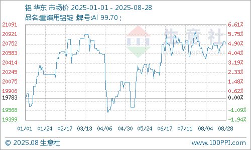 近期铝价横盘震荡,8月28日铝价小幅波动。据生意社商品行情分析系统,截止2025年8月28日国内铝锭华东市场均价20746.67元/吨,较8月1日市场均价20596.67元/吨,上涨0.73%。