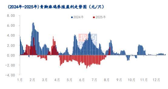 3. 青脚麻鸡:迎来盈利拐点 青脚麻鸡养殖在8月迎来显著改善。7月养殖端月均理论亏损为0.71元/只,虽仍处于亏损区间,但相较于6月,盈利回升幅度达1.64元/只,环比增幅高达69.79%。 8月综合养殖成本降至4.31元/斤,较7月再降0.26元/斤,创下2025年以来成本最低点。按照4.50元/斤的均价与4.31元/斤的成本测算,单只青脚麻鸡养殖利润有望达到0.5元以上,迎来4个月以来首次盈利。