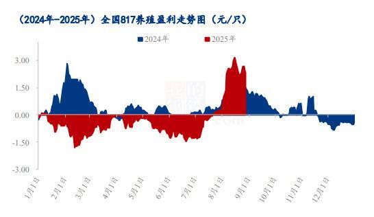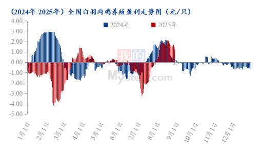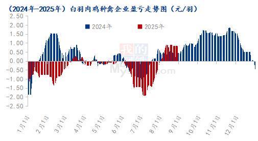 导语: 肉鸡行业正经历供需再平衡与结构性调整的关键阶段。2025年下半年,随着供应增幅放缓季节性需求回暖,行业有望从深度亏损走向边际改善,但各品种分化明显。进入8月下旬,肉鸡养殖成为畜禽产业中少有的盈利亮点,每只肉鸡盈利达2-3元,而生猪和蛋鸡则陷入亏损困境。 一、宏观环境:消费疲软与成本压力并存 2025年中国经济仍处于温和调整期,居民消费意愿偏弱,对肉类蛋白需求形成压制。餐饮行业经营压力较大,企业采购量同比下降明显,作为猪肉主要替代品的鸡肉消费因此受到拖累。 尽管面临需求挑战,饲料成本呈现分化态势:豆粕价格受美豆天气炒作及国内油厂限量销售影响,维持在3000-3100元/吨高位;而玉米因新粮上市临近,贸易商抛售陈粮,价格持续走弱,全国玉米周度均价下探至2381元/吨。这种成本结构差异直接影响不同养殖模式的盈利空间。 二、总体盈利格局:肉鸡独秀 根据钢联农产品监测数据显示:当前我国畜禽养殖业呈现明显分化态势。 肉鸡养殖预期盈利增加,根据钢联数据监测,本周毛鸡平均养殖盈利 1.60 元/只,盈利有所缩减但仍旧较为丰厚;生猪养殖亏损情况整体有所缓解,但不同养殖模式差异显著。其中,自繁自养模式头均亏损 7.85 元;外购仔猪则仍头均亏损 210.07元;蛋鸡养殖处于亏损阶段,蛋鸡养殖成本 3.53 元/斤,养殖盈利-0.40 元/斤,跌幅 17.65%。这种分化格局主要源于供需基本面的差异。具体看一下肉鸡个品种环节的盈亏情况。 三、肉鸡各品种各环节盈亏分析 1. 白羽肉鸡:盈利改善 据 Mysteel 农产品数据统计,本周父母代种禽企业平均孵化盈亏为 0.84 元/羽,较 上周下调 0.05 元/羽,环比跌幅 5.62%。本周种禽企业盈利尚可,整体稍有缩减。主要 原因是鸡苗价格微幅下滑的影响,种禽企业盈利空间缩小,种禽端在成本变动不大的 前提下,鸡苗价格下滑,盈利空间减少。