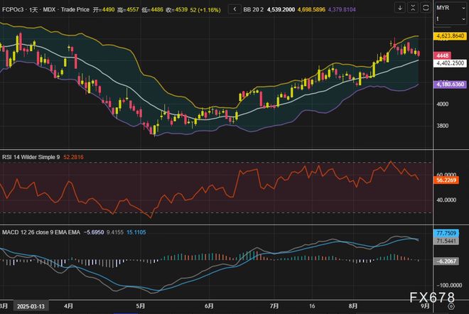 一、行情驱动:外部市场与货币因素主导 今日棕榈油价格下行主要受两方面因素压制: 1. 竞争油脂价格走弱:芝加哥期货交易所(CBOT)豆油合约当日下跌0.3%,中国大连商品交易所豆油主力合约(DBYcv1)下跌0.55%,棕榈油合约(DCPcv1)下跌1.09%。作为全球植物油市场的关键竞争者,豆油价格的疲软直接削弱了棕榈油的短期吸引力。 2. 林吉特走强:马来西亚林吉特兑美元汇率今日升值0.43%,使得以林吉特计价的棕榈油对海外买家而言成本上升,进一步抑制需求预期。 二、基本面:供应偏紧与出口韧性形成支撑 尽管外部市场施压,但马来西亚本土基本面仍呈现韧性。 据马来西亚知名经纪商Pelindung Bestari总监Paramalingam Supramaniam指出:“本月马来西亚棕榈油产量低于预期,同时出口需求保持稳健,这为价格提供了底部支撑。” 这一观点与近期行业数据吻合:8月以来马来西亚部分种植区受季节性天气影响,鲜果串采收进度放缓,而出口至印度、欧盟等地的订单量仍维持在较高水平。 三、宏观与能源市场联动 原油市场今日亦对棕榈油形成间接拖累。国际油价在夏季出行旺季结束后承压,且俄罗斯恢复向匈牙利、斯洛伐克输送原油,加剧了市场对供应宽松的预期。原油价格走弱降低了棕榈油作为生物柴油原料的经济性,一定程度上削弱了其能源属性溢价。 四、机构观点:短期调整不改中长期逻辑 Paramalingam Supramaniam(Pelindung Bestari)强调:“尽管豆油价格走弱带来短期压力,但马来西亚供应偏紧和出口需求旺盛的格局并未改变,价格下行空间有限。” 此外,市场关注近期可能举行的中美高层经贸磋商。若中国同意增加对美国大豆的采购,可能进一步压制豆油价格,从而间接影响棕榈油市场。但目前谈判细节尚未明朗,市场持谨慎观望态度。 五、技术面:关键指标提示震荡整理 从技术指标看,棕榈油主力合约日线级别布林带(20,2)中轨位于4539林吉特,价格目前运行于中轨下方;MACD(12,26,9)虽仍处于负值区间(-5.6950),但快慢线差值收窄,显示下跌动能减弱;RSI(14)为52.28,处于中性区间,表明市场暂未进入超买或超卖状态。整体技术结构指向短期震荡整理。 六、展望:关注政策动向与供需数据 未来一周,市场需重点关注两方面: 1. 中美磋商进展:若中国扩大美国农产品进口,可能对豆系油脂价格形成进一步压制; 2. 马来西亚8月产销数据:若产量环比下滑且出口维持高位,将强化基本面支撑逻辑。 尽管短期外围市场波动可能延续,但在马来西亚本土供需偏紧的背景下,棕榈油价格深跌概率较低。中长期走势仍需观察产区产量恢复节奏及全球植物油库存变化。