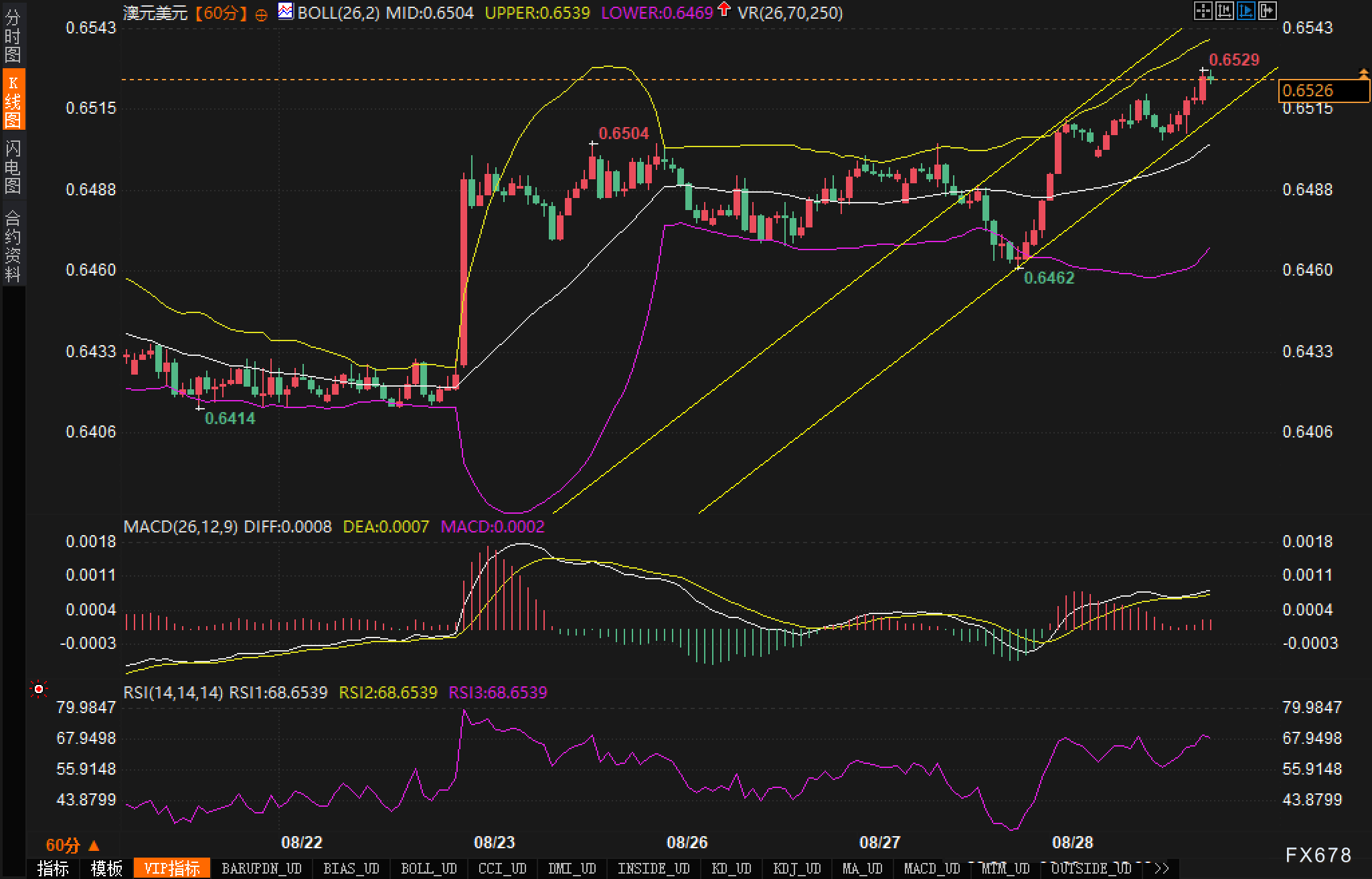 周四(8月28日),澳元/美元一度推升至0.6530一线附近。美元指数DXY回落至97.90附近;CME FedWatch显示9月降息概率约87%。纽约联储主席威廉姆斯表示,为支撑放缓的GDP,某个时点需要降息,但9月决议仍需更多数据验证。市场将于周五迎来7月PCE物价指数。澳洲方面,7月月度CPI同比2.8%,高于2.3%的预期及此前1.9%,使得市场对澳洲联储在9月下旬再度降息的押注降温。上述组合催化,使汇价延续拉升。 ![]() 本轮上行首先来自美元端的系统性回落。随着“软着陆+温和通胀”的叙事转向“增长放缓、需政策缓冲”,美元的利差优势被快速重定价。87%的降息概率将资金久期推向更长端,美元收益率曲线的“实际利差”收窄,触发多头减仓与空头回补的量能前导。同时,周五PCE作为美联储偏好的通胀口径,成为短线波动率的核心定时器,数据前的风险管理驱动美元先行降温。 澳洲端则提供“相对支撑”。2.8%的CPI同比读数打破此前的温和轨迹,澳洲联储的“继续观察”倾向得到强化,削弱了“急切降息”的市场共识。利差与政策路径的相对稳定,使得澳元在美元走弱的背景下具有动量投资属性。此外,大宗商品整体韧性也改善了澳元的流动性与风险偏好定价,汇价获得“内外共振”的推动。 技术面: 1小时K线显示,汇价沿上升通道运行,最新价位0.6526—0.6529区间,逼近通道上轨。布林带上轨0.6539,中轨0.6504,下轨0.6469,带宽温和扩张,体现“趋势延续而非极端扩散”。价格自0.6462的回撤低点再度上攻,期间完成对布林中轨0.6504的二次回测与站稳,趋势线得到验证。 ![]() 关键价位:阻力—0.6539(布林上轨)、0.6545(图示上沿刻度与通道压力汇合);支撑—0.6504(布林中轨/回测位)、0.6488(短支撑)、0.6469(布林下轨)、0.6462(回撤低点/结构性支撑)、0.6414(更低平台)。只要0.6504不失守,上升趋势主线不变;跌破则意味着进入回撤—回测阶段,需观察0.6488/0.6469的吸筹能力与量价配合。 市场情绪观察 从群体心理与市场情绪维度看,本轮上行更多体现为“美元空头与澳元顺势多头的双向强化”。降息预期将“恐惧与贪婪”的摆锤推向多头市场情绪,资金偏向趋势交易与动量跟随。但在PCE公布前,事件风险促使部分中短线资金采取“先涨后锁”的仓位管理,这会在高位制造间歇性的振荡—洗盘,使得1小时级别的RSI容易在70上下反复。期权端的被动对冲可能放大短线挤压,一旦上破0.6539未能放量确认,易出现假突破与小级别“冲高回落”的十字星形态。整体而言,情绪并未过热,但波动率确实因数据而抬升,交易员对滑点与止损触发的阈值更为敏感。 后市展望: 短线(1–3日): 多头路径:若汇价能够在0.6504之上收出连续阳线并有效上破0.6539/0.6545,通道上沿将被量能突破,价格有望在上升通道内继续“台阶式”走高。届时,MACD柱状图应同步放大,RSI短暂越过70属正常的趋势加速现象,随后可能以“回测0.6530—0.6539区间”为确认动作。 空头路径:若0.6539—0.6545压力带多次受阻且伴随RSI顶背离,则倾向演绎为回撤,先看0.6504中轨支撑;失守将指向0.6488与0.6469,跌破0.6462方构成对小时级上升结构的破坏,届时MACD恐转为死叉并回到零轴下方,短线趋势切换为盘整—下探。 中线(1–2周): 走势仍取决于政策与数据共振: 若PCE维持温和、降息预期被巩固,同时澳洲联储维持观望或偏中性,澳元/美元的主要趋势有望保持上行通道内的趋势延续。在这种情形下,回撤多以“中轨—上轨之间的均值回归”展开,动量指标与布林带宽度将呈现周期性扩张/收缩的“呼吸节奏”。 若PCE意外抬升、降息押注降温,美元将出现反身性的快速修正,澳元/美元可能测试0.6469—0.6462的静态支撑。只有有效跌破并在回抽不破的条件下,才可确认趋势反转成立,延伸看更下方0.6414的支撑转阻力验证。 |