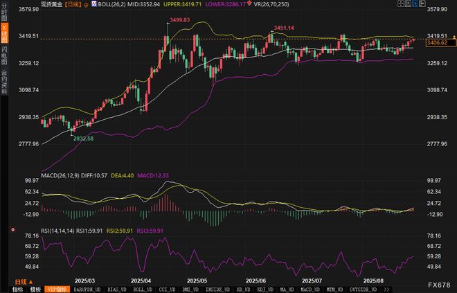 汇通财经讯——周四(8月28日),现货黄金连续第三日延续升势,美市盘前围绕3406美元一线高位震荡,逼近两周多新高。隔夜美元回落与美债收益率下行为金价提供了继续上攻的外部条件;当前价格仍处于关键阻力密集区附近,市场把焦点转向北京时间今晚20:30(12:30 GMT)公布的一揽子美国数据。 汇通财经APP讯——周四(8月28日),现货黄金连续第三日延续升势,美市盘前围绕3406美元一线高位震荡,逼近两周多新高。隔夜美元回落与美债收益率下行为金价提供了继续上攻的外部条件;当前价格仍处于关键阻力密集区附近,市场把焦点转向北京时间今晚20:30(12:30 GMT)公布的一揽子美国数据。