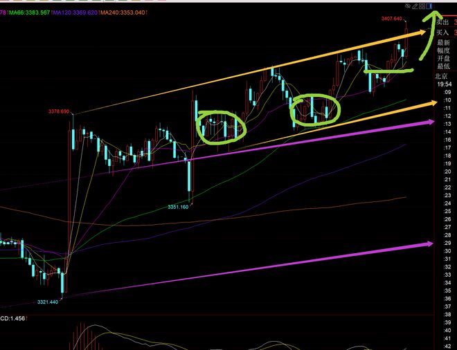 第三,黄金小时线级别:今日早间亚盘走了类似前两日的循环,隔夜强势收盘于高位,今日依旧未出现续涨,先压制一波下跌,原计划靠近日线5均线3380上继续看涨,也是依托66日均线处,可惜价格略差,只给到3384.5, 50%分割位置;然后直接探底拉升,欧盘再次破了亚盘高点,这点就打破前两日循环了,并非出现10米范围内持续的整理走势,提前发力上攻;此时又上破黄色通道上轨,虽然macd一直处于多重顶背离状态,但当前走势依旧偏强,且欧盘破高,一般美盘会有二次拉升,今晚冲击日线新收敛三角阻力3314一线概率还是比较大的;支撑由早间3384.5,已有所上移至3394-95,3398-99都存在一定顶底支撑,要保持震荡式逼空上拉,就必须守住中轨3394-95;若守不住就转为震荡,再次指向3385-84; 因此,3394-3399支撑考虑继续看涨,阻力目标先看3414一线,再往上是3425一线;按照规律,后半夜都容易维持日内高点,第二天亚盘10点前才会打压,所以今晚还是谨慎看跌,时间节点最好等明日早盘; 除非它有效失守中轨,那么可以反弹看一波10米-15米下跌,见好就收就行;