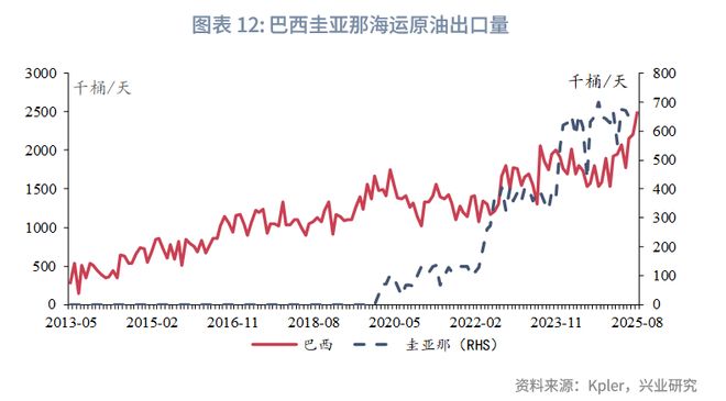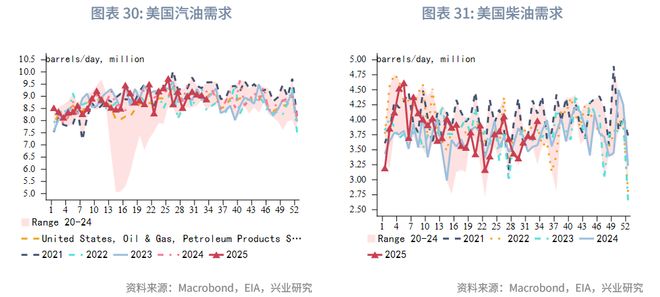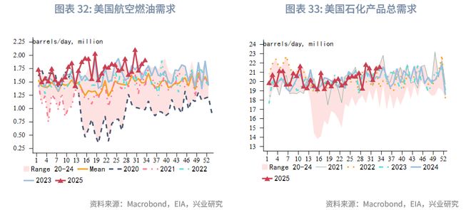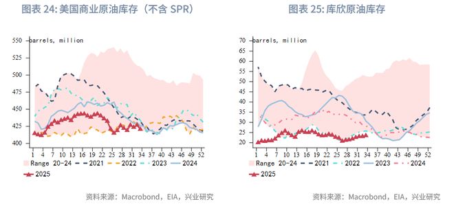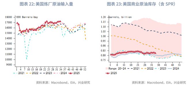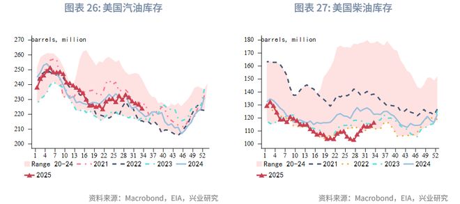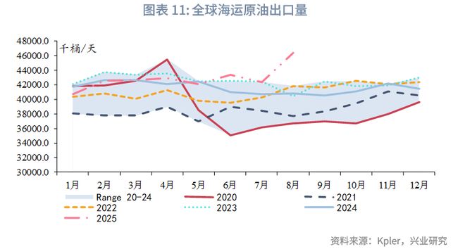 二、基本面纵览: 2.1 OPEC+出口增速慢于预期、页岩油增速放缓 OPEC+8月初如期宣布将于9月增产54.7万桶/天,这是继5月、6月、7月增产41万桶/天,8月增产54.8万桶/天后的连续第五个月大幅增产,至此220万桶/天自愿减产回补计划完毕,提前一年扭转2023年大幅减产的局面。尽管市场担心OPEC+八个核心成员国迅速退出减产、沙特和阿联酋出口大幅增加,会将原油市场推向供应过剩,但截至目前这种局面尚未出现。自四月启动减产回补计划以来,OPEC+8国出口增长幅度低于市场预期,根据OilX实时预测数据,八月OPEC+8国出口量仅较三月增加61万桶/天,大幅低于期间自愿产量目标增幅。九月的实时预测数据虽可能大幅修正,但目前并未显示显著增长。 与此同时全球原油出口量依然强劲,持续高于近十年同期季节性平均水平。2025年夏季需求总体表现强劲,吸纳了由巴西和圭亚那引领的南美供应增量,以及中东地区在OPEC+持续放松减产背景下的产量提升。在北半球夏季用油高峰临近尾声之际,市场整体呈现供需平衡状态。然而,市场担忧情绪正在升温:一旦夏季需求旺季结束、OPEC+减产完全退出,第四季度可能出现供应过剩,从而压低油价。不过我们需要提醒的是,这一担忧在今年持续出现,但实际供给过剩兑现的情况却持续不及预期。因为维持中东地区一定程度的动荡以及随之带来的地缘溢价,可能本来也是某些国家的诉求。中东地区的地缘动荡,会使原油市场计入地缘溢价,而这能在一定程度上支撑油价。理想的情况是中东持续紧张,但升级幅度有限,油价虽有下行压力但幅度有限。 目前市场预期因中东地区夏季发电需求残余影响届时将彻底消退,OPEC+出口量十月将出现强劲反弹,但若因故导致出口增长连续低于预期,市场可能将重新评估2025年第四季度及2026年的大幅看空预期。另一需考量的因素是若未来数周显示普京成为乌克兰停战的主要障碍,美国可能对俄罗斯石油实施进一步制裁或关税,尽管特朗普在近期会谈后暂缓了行动。这一行动可能包括对购买俄罗斯烃类产品的买家实施次级关税和/或加强对俄罗斯影子船队的制裁。特朗普仍视这些手段为迫使普京达成协议的手段而非终极目的。若其认定普京无意终止战争(无论施加何种制裁),美国政策路径可能会转向实质性增加对乌克兰的西方武器输送。 同时美国页岩油产量增长继续放缓,因成本上升和效率放缓侵蚀了增长动能。尽管更长的水平段、更先进的压裂技术带来了效率提升,但已无法完全抵消开发成本的上涨。过去十年里,美国页岩油贡献了全球供应的大部分增量,OPEC+快速解除此前的减产,短短时间就向市场投放了逾200万桶/天的原油,油价徘徊于60美元/桶一线,陆上及海上生产商都已削减活动,以保存资本等待转机。