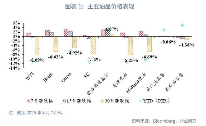 油价 2025年8月,油价震荡走低。7月末受俄乌冲突升级预期和红海航运风险支撑,油价震荡上行。此后油价转势向下,中旬美国总统特朗普推动俄美乌三方阿拉斯加会谈,但普京提出的“反对西方驻军”停火条件与乌克兰领土争议导致谈判陷入僵局,特朗普更威胁“若两周内未直接会晤将实施大规模制裁或关税”,市场担忧冲突烈度升高,油价得到支撑。8月23日,美联储主席鲍威尔在杰克逊霍尔年会释放明确降息信号,强调“就业风险高于通胀”,暗示9月政策调整“迫在眉睫”,此举引发美元指数单日大跌,美债收益率下行,黄金、原油等大宗商品集体反弹。 总体而言,随着季节性旺季结束,以及OPEC+逐步增产,原油有下行压力,但这可能更多体现在价差层面。今年以来市场所预期的大幅累库持续不及预期,OPEC+近几个月出口回升幅度也弱于预期,抑制了油价下行的幅度。同时原油的高Back结构也在实操层面抑制空头持仓意愿。OPEC+未来出口回升情况以及俄乌能否停战将是市场关注焦点。 一、2025年8月回顾 2025年8月,油价震荡走低。7月末受俄乌冲突升级预期和红海航运风险支撑,油价震荡上行。此后油价转势向下,中旬美国总统特朗普推动俄美乌三方阿拉斯加会谈,但普京提出的“反对西方驻军”停火条件与乌克兰领土争议导致谈判陷入僵局,特朗普更威胁“若两周内未直接会晤将实施大规模制裁或关税”,市场担忧冲突烈度升高,油价得到支撑。8月23日,美联储主席鲍威尔在杰克逊霍尔年会释放明确降息信号,强调“就业风险高于通胀”,暗示9月政策调整“迫在眉睫”,此举引发美元指数单日大跌,美债收益率下行,黄金、原油等大宗商品集体反弹。 截至8月22日,本月WTI累计跌幅8.09%;Brent累计跌幅6.62%;Oman累计跌幅4.92%;SC累计跌幅7.71%。