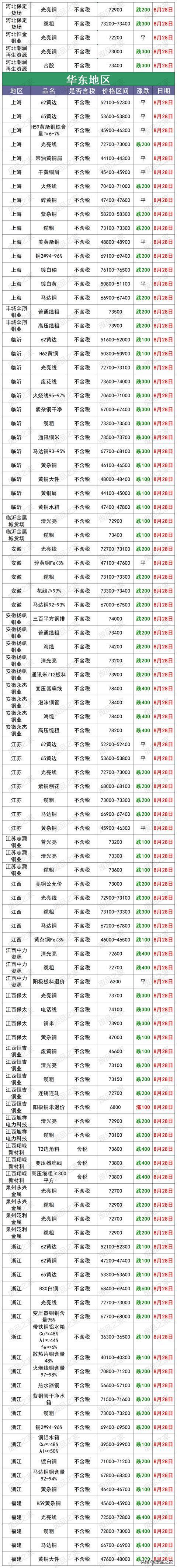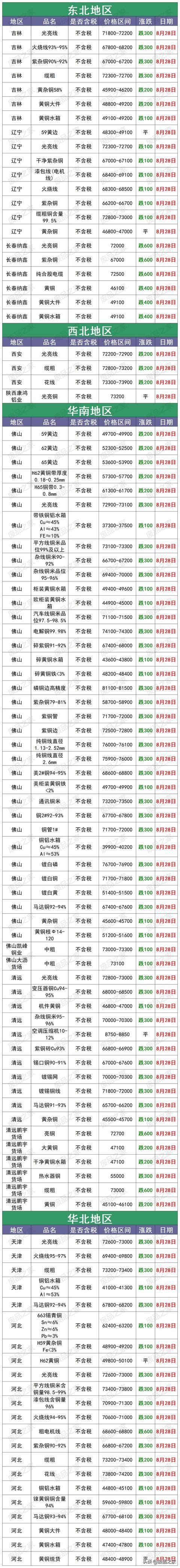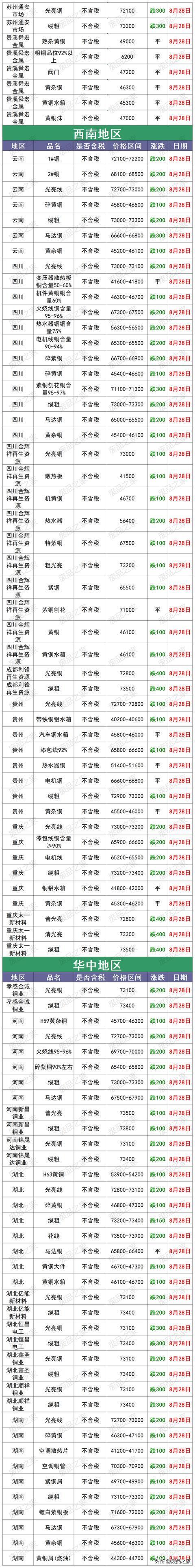 最新8月28日全国再生铜业厂家废铜调价信息汇总 8月28日起,吉林长春纳鑫再生资源回收废铜采购价:纯合股电缆铜72500元/吨,光亮铜72000元/吨,紫杂铜67000元/吨,黄铜大件49100元/吨,黄铜46100元/吨,黄铜水箱49100元/吨。 8月28日起,广东佛山凯峰铜业废铜采购价:中粗73100元/吨,缆粗73400元/吨左右。 二次调价▼8月28日起,广东佛山凯峰铜业废铜采购价跌100:中粗73000元/吨,缆粗73300元/吨左右。 8月28日起,广东佛山大沥货场废铜调价:中粗73100,大粗73400。 8月28日起,河北潮澜再生资源废铜采购价:普光亮铜73400元/吨。大量回收:废旧铜芯电缆、铜芯电线、铝线、铝缆(带皮),电机,变压器,钢厂9风口,结晶器铜管,硅铁厂的铜瓦,水冷电缆等含铜料,有货均可电联商议。 8月28日起,河北保定货场废铜采购价:合股报价:73300元/吨。 8月28日起,河北保定兴隆铜业废铜采购价:亮合股73300元/吨。 8月28日起,山东临沂金属城货场废铜采购价:纯条73400元/吨,亮铜72900元/吨。 8月28日起,安徽扬帆铜业废铜采购价:海缆74200元/吨;清一色300,高压/铜牌74000元/吨;清一色T2料铜米波纹管73900元/吨;清一色揽粗73600元/吨;普通缆粗73400元/吨;清光亮/清一色渡白板73500元/吨;普通光亮/干净铜管73000元/吨;杂铜管/散热器管/破碎管72800吨限量采购满暂停。订货先确认收货品类,含镍/等元素超标商议降收/换料。备注:报价不等于定价。行情波动较大或者订货量达到一定数量价格会随时调整或者暂停接单。 8月28日起,江西贵溪舜宏金属废铜采购价:黄杂铜46300元/吨,黄铜沫47000元/吨,熟杂黄铜49000元/吨,阀门47200元/吨,黄铜水箱45300元/吨,粗铜退价(盘面价-6200)*品味。 8月28日起,江西抚州恒吉铜业废铜采购价:混光亮72800元/吨,连铸连轧72700乘品味,清光亮73100元/吨,缆粗73150元/吨。铜米退6800,其它原料退7100。废黄铜46600元/吨。 8月28日起,江西丰城众翔铜业废铜收货价:低压缆粗:73500;高压缆粗:73900。 8月28日起,江苏苏州通安市场废铜采购价:普光亮72100,全绞丝73300,优质T2料73300,臭皮铜(300以上),T2大板料73500。 8月28日起,江西翔嵘新材料废铜采购价:T2整版大料、300以上的高压缆粗、干净的变压器扁线、通信波纹铜皮价为73800,清一色T2料价为73600,超高压电缆73800,铜米倒扣5650。 8月28日起,江西旭祥电力科技废铜采购价:光亮报价72900元/吨,缆粗73100元/吨,连铸连轧73300元/吨X品,另收铜管,度白铜牌,漆包线等,以上均为送到价格,三天结清,也可寄存。 8月28日起,河北恒金铜业废铜收货价:光亮铜72200元/吨,合股杂铜72700元/吨,旧特杂管72000元/吨只接受7天内到货订单(有货商议)(一手缆粗议价)订货电话联系随时停收。 8月28日起,广东清远鹏宇货场废铜收货价:亮铜,缆粗72700-73000,铜管、铜板70700-71700,漆包线、火烧铜68700-70700,大黄铜47100、黄铜统货45100-46100、干净黄铜水箱47100、热水器铜55000,铜铝水箱40300。 8月28日起,四川成都利锋再生资源废铜收货价:光亮铜:72800,清光亮73300,缆粗73500。 8月28日起,重庆太一再生回收废铜采购价:普光亮72800元/吨,清光亮73300元/吨,缆粗73500元/吨。品味铜电话联系。 8月28日起,四川绵阳金辉祥废铜采购价:粗光亮73.2,清光亮73,普光亮72.5,特紫67.5,紫铜65.5,紫铜刨花69-70,烤水后无杂71,黄铜46.1,机黄铜46.7,黄铜水箱46.1,热水器56.4,散热板41.5。单位:元/kg。 8月28日起,贵州贵阳东站回收公司废铜采购价:缆粗73,光亮铜72.8,电机铜66.8,普铜62.8,大机铜47,小黄铜46,铜水箱46,铜铝水箱40.6,热水器水箱51.6,单位:元/kg。 8月28日起,安徽永杰铜业废铜采购价:海缆、泡沫铜管:78400,变压器扁线:78400,高压缆粗、无氧丝:78200,T2料:78200,注:采购价格为增票(13%)到厂价,价格随盘面随时变动,订货以信息确认为准。 8月28日起,江西东承铜业/博升铜业废铜采购价:缆粗73000,清光亮72800,连铸连轧72500,阳极板退价6500x品味,以上价格到厂全部现金当天下磅打款,可自提。 8月28日起,福建泉州泛利金属废铜采购价:光亮铜72700元/吨,缆粗72900元/吨。 8月28日起,江西中力资源铜业废铜采购价:清光亮72600,连铸连轧铜72600乘品位,阳极倒扣6200乘品位。可寄存可点价。 8月28日起,福建泉州永兴金属废铜采购价:光亮铜72700元/吨,缆粗铜现款72900元/吨。 8月28日起,江苏志灏铜业废铜采购价:普光73200,清光73300,缆粗73600。 8月28日起,湖北顺祥铜业瑞虎再生资源废铜采购价:光亮铜价格:73100元/吨,反向开票价:73400元/吨,缆粗铜:+300元/吨。铜米收98%以上,镍不能超200,铜米按品位结算,以上报价为到厂价,货到当天付款!只接受3天内到货订单。 8月28日起,湖北孝感金诚铜业废铜采购价:缆粗铜:+300元/吨;光亮铜:73500元/吨反向开票;光亮铜:73100元/吨,品味铜:按品味计价,以上报价为到厂价,只接受7天到货订单,价格不合适,可以选择寄存,《寄存可付70%货款》!温馨提示:行情波动较大或者订货量达到一定数量价格会随时调整或者暂停接单! 8月28日起,湖北恩施阜顺铜业废铜采购价:不反向光亮73100元/吨,缆粗73400元/吨,送到。 8月28日起,河南锦泰达铜业废铜采购价:光亮铜73100元/吨,缆粗加300。 8月28日起,河南南阳振星铜业废铜采购价:光亮铜报价73400元/吨,需反向开票,限5车价格不合适可以沟通存货。 8月28日起,湖北亿能新材料废铜采购价:反开亮铜报价73500元/吨,亮铜报价73100元/吨,只接受一周内到货的订单。 8月28日起,湖北恒昌电工材料有限公司废铜采购价:亮铜报价73100元/吨,反开亮铜报价73500元/吨,只接