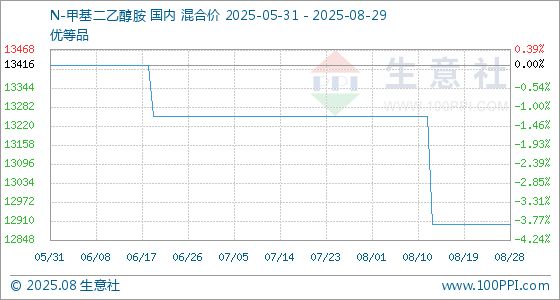 8月29日,生意社N-甲基二乙醇胺基准价为12900.00元/吨,与本月初(13250.00元/吨)相比,下降了2.64%。