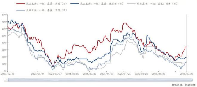 近日连盘豆油主力合约Y2601迎来回调态势,在缓慢下跌过程中,豆油现货基差低位上涨,而市场关注点聚焦在豆油出口能否继续增加,影响国内正常供需平衡,以及四季度美豆买船能否实现,从供应端维持豆油正常供应。进入9月,国内豆油出口陆续来到执行阶段,出口方在市场上收货引发地区性豆油基差上涨,9-12出口豆油或将再增加,出口豆油利润明显高于国内豆油价格,两者价差进一步提升出口商的积极性。豆油出口的持续放量打破了传统供需平衡,而豆油基差在经历阶段性低位后呈现反弹态势,值得市场参与者高度关注。 截止到8月28日,全国豆油基差均价在178元/吨,天津130元/吨周度环比上涨30元/吨,山东120元/吨周度环比上涨40元/吨,江苏200元/吨周度环比上涨170元/吨,广东340元/吨周度环比上涨40元/吨,沿海主流市场基差稳中偏强但区域分化。“北油南调”打破区域供需,抬升北方基差涨势。南方局部地区市场供应紧张但空头补货积极,支撑豆油基差走强,高库存环境下基差承压,但成本上升预期和未来去库逻辑支撑基差走势。