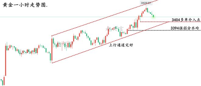 对于今天黄金走势的看法! 从今天的走势来看,价格已经破位高点3400后仍然没有明显的承压情况,可以看出来多头还在发力,表明强势走势还在继续。而且日线基本没出现大阴,还有大阳继续上升带动,那么能够预测到的就是点位越高反复性越大,所以应该还有回踩。按照日线节奏而言,最理想的做多不是追,而是回落后买入,也就是回撤修正,继续保持上行。 同时上升中,任何时候,不能放弃的都是双底做多。所以,就是小时线3394的位置,以及昨晚的低点3404,重点是后续的行情,极容易回调后继续大涨,所以若探高后不涨,就一定要注意回调探底发力。一旦再走出极强行情,那么必定会再度破高上涨!