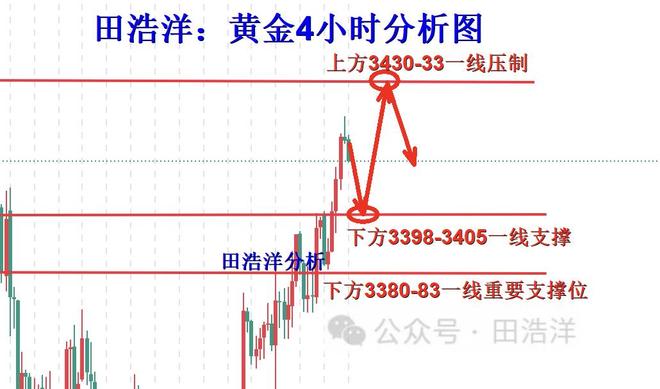 从4小时分析来看,下方短期支撑关注3398-3403附近,重点关注3380-83一线支撑,日内回踩依托此位置继续主多顺势看涨不变,短期多头强势分界线关注3370关口,日线级别只要企稳此位置上方继续保持回踩低多顺势看涨节奏,逆势空单一律不参与。具体操作策略我会在盘中提示,及时关注。 黄金操作策略: 1、黄金回踩3398-3403一线做多,回踩3380-85一线补仓多,止损3376,目标3425-3430一线,破位继续持有; 文/田浩洋——专业国际市场点评,针对实际市场参与者,考虑到部分市场窗口对于实盘交易具有一定的时效性可关注笔者,从而能够选择合适的策略进行操作。对黄金、原油、白银等大宗商品有深入的研究,如果你做单不顺或投资经常资金缩水,那么你可以关注田浩洋本人。 |