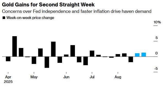 交易员们也在仔细研究美联储理事沃勒周四发表的言论。沃勒是明年接替鲍威尔担任美联储主席的有力竞争者,他表示将在 9 月支持降息25个基点,并预计未来三到六个月还会进一步降息。 掉期市场预计下个月有约 85%的可能性会降息,但 9 月之后,对于通胀和美国劳动力市场未来的发展态势,存在很大的不确定性,因为特朗普的关税政策对经济的影响仍在持续显现。 对于美联储独立性受到威胁的担忧日益加剧,这也推动了黄金价格的上涨。此前,特朗普本周已采取行动试图罢免美联储理事莉萨·库克。 本周以来,黄金价格已上涨 1.3%,逐渐逼近 4 月份约每盎司 3500 美元的历史最高价。贸易和地缘政治方面的摩擦、交易所交易基金的资金流入以及各大央行减少对美元依赖的举措,也支撑了黄金作为避险资产的地位。 截至发稿,现货黄金价格维持在每盎司 3415.73 美元,与周四相比上涨了 0.6%。彭博美元现货指数持平,此前一交易日该指数下跌了 0.3%。白银价格保持稳定,而铂金和钯金价格则略有下跌。 |