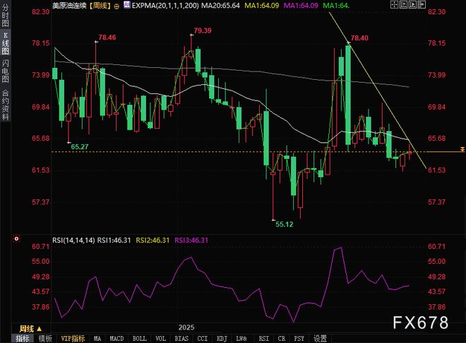 (CBOE原油波动率指数图) 只要该指数持续下行,就未见可能引发油价剧烈波动的即时风险迹象。这表明短期内市场处于风险可控的适度信心环境。若此稳定性得以维持,近期原油市场的买压可能在后续交易时段显得更为重要。 技术展望 整体依然处于下降趋势之中,从技术层面上来看,均线压力尚未突破之前,暂时维持区间震荡。 看跌倾向初露端倪:近几周WTI油价逐步走低,显现逐渐形成的看跌倾向。目前尚未出现足够信号确认新一轮稳健升势,当前油价缺乏明确长期方向,且面临20周指数移动平均线(EMA)(65.64)关键阻力位,这为短期走低提供了一定支持。 14日相对强弱指数(RSI)线较微偏移50中线,处中线下方位置,凸显走低动能,增强形成更稳定看跌倾向的可能性。