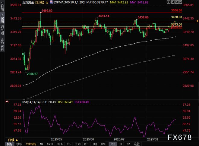 相关因素分析 美国经济分析局(BEA)周四数据显示,第二季度美国GDP年化季率增长3.3%,优于初始估值3.0%,且高于市场预期的3.1%,显示了经济韧性,一定程度上限制金价上行空间。 截至8月23日当周,美国初请失业金人数降至22.9万,前值23.4万(从23.5万修正)。该数据低于市场预期的23万。 纽约联储主席约翰·威廉姆斯周三表示,利率可能在未来某个时点下调,但政策制定者需要依据后续经济数据来决定下月是否适合降息。 根据CME FedWatch工具显示,交易员目前预计美联储下月降息25个基点的概率接近85%。 市场对美联储将在9月会议上降息的预期升温,以及纽约联储主席约翰·威廉姆斯的鸽派言论,可能对贵金属形成支撑,利率下调可能会降低持有黄金的机会成本。 周五晚些时候,美国7月个人消费支出(PCE)物价指数报告将成为焦点。预计7月整体PCE同比上涨2.6%,核心PCE预计同期上涨2.9%。 技术分析 现货黄金日内虽处跌势,但贵金属长期看涨基调未改。日线图显示价格坚守在100日指数移动平均线(EMA)(3279.45)这一关键技术位上方。14日相对强弱指数(RSI)稳居中线上方处60.50附近,印证近期看涨动能延续。 上行方面,布林带上轨3425美元构成金价近期阻力位,有效突破该水平将推动黄金上探7月23日高点3438.80美元,后续关键目标位看向4月22日高点3500美元心理关口。 下行方面,初始支撑位见于8月27日低点3373美元。若日K线收低于该水平,可能下探8月26日低点3351美元。布林带下轨3310美元构成额外下行防护屏障。