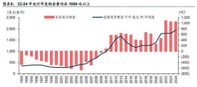 4、2022年以来,央行主导黄金价格 其实从2008年金融危机美国大撒钱之后,全球央行就受不了被剪羊毛,开始买入黄金。但真正爆发大笔买入黄金还是从2022年俄乌战争爆发后。 当时各国买入黄金这不仅是避险情绪,而是大家看到美国直接冻结俄罗斯资产之后,觉得美元美债关键时刻不靠谱,开始进行分散化配置。所以我们看到2022年开始,全球央行每年买入黄金都超过1000吨,是之前的2倍。