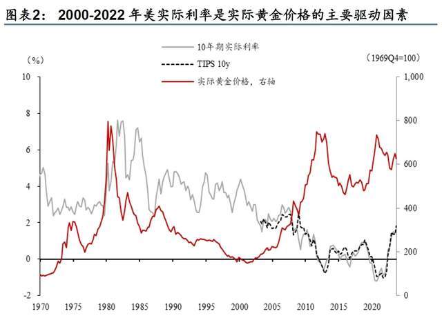 2、1980-2000年,美国一家独大、美元强势,黄金被抛弃 这是第一轮黄金熊市。这期间美国经济好转,通胀控制较低水平,美元指数上升,更重要的是全球进入新格局,美国在全球一家独大,各国央行持续抛售黄金,买入有利息的美债,金价下跌。 3、2000-2022年,黄金跟着美国实际利率走 这期间美国依然一家独大,由于黄金ETF的诞生,机构投资者成为黄金定价的主力,因为黄金不产生利息,他们更关注持有黄金的机会成本。因此,美债收益率走高或者美元走弱的时候黄金整体表现强势。