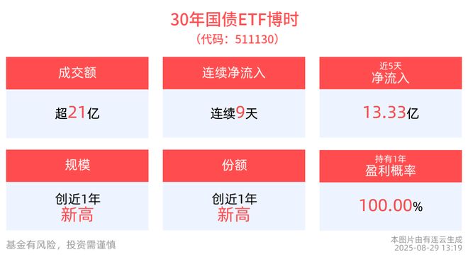 截至2025年8月29日13:19,30年国债ETF博时(511130)上涨0.18%,最新价报108.71元。拉长时间看,截至2025年8月28日,30年国债ETF博时近1年累计上涨6.61%。 流动性方面,30年国债ETF博时盘中换手11.38%,成交21.69亿元,市场交投活跃。拉长时间看,截至8月28日,30年国债ETF博时近1月日均成交46.23亿元。 国债期货早盘全线上涨,30年期主力合约涨0.22%,10年期主力合约涨0.05%,5年期主力合约涨0.05%,2年期主力合约涨0.03%。8月29日,央行开展7829亿元7天逆回购操作,操作利率为1.40%,与此前持平。因今日有3612亿元7天期逆回购到期,此次操作实现净投放4217亿元。 8月27日,财政部在香港特别行政区,面向机构投资者招标发行2025年第四期125亿元人民币国债,受到投资者广泛欢迎,认购倍数3.35倍。川财证券表示,作为年内第四期发行,此次人民币国债发行延续了常态化节奏,既为香港离岸人民币市场提供了优质资产,也稳定了市场预期。 规模方面,30年国债ETF博时最新规模达190.04亿元,创近1年新高。 份额方面,30年国债ETF博时最新份额达1.75亿份,创近1年新高。 从资金净流入方面来看,30年国债ETF博时近9天获得连续资金净流入,最高单日获得15.04亿元净流入,合计“吸金”34.19亿元,日均净流入达3.80亿元。 数据显示,杠杆资金持续布局中。30年国债ETF博时连续3天获杠杆资金净买入,最高单日获得6723.35万元净买入,最新融资余额达2.38亿元。 截至8月28日,30年国债ETF博时近1年净值上涨6.57%,指数债券型基金排名6/287,居于前2.09%。从收益能力看,截至2025年8月28日,30年国债ETF博时自成立以来,最高单月回报为5.35%,最长连涨月数为4个月,最长连涨涨幅为10.58%,涨跌月数比为10/6,上涨月份平均收益率为2.09%,月盈利百分比为62.50%,月盈利概率为64.46%,历史持有1年盈利概率为100.00%。截至2025年8月27日,30年国债ETF博时近1年超越基准年化收益为0.05%。 回撤方面,截至2025年8月27日,30年国债ETF博时近半年最大回撤4.93%,相对基准回撤0.53%。 费率方面,30年国债ETF博时管理费率为0.15%,托管费率为0.05%。 跟踪精度方面,截至2025年8月28日,30年国债ETF博时近3月跟踪误差为0.054%。 30年国债ETF博时紧密跟踪上证30年期国债指数,上证30年期国债指数从上海证券交易所上市的国债中,选取符合中国金融期货交易所30年期国债期货近月合约可交割条件的债券作为指数样本,以反映沪市相应期限国债的整体表现。 以上产品风险等级为:中低(此为管理人评级,具体销售以各代销机构评级为准) 风险提示:基金不同于银行储蓄和债券等固定收益预期的金融工具,不同类型的基金风险收益情况不同,投资人既可能分享基金投资所产生的收益,也可能承担基金投资所带来的损失。基金的过往业绩并不预示其未来表现。投资者应了解基金的风险收益情况,结合自身投资目的、期限、投资经验及风险承受能力谨慎决策并自行承担风险,不应采信不符合法律法规要求的销售行为及违规宣传推介材料。 以上内容与数据,与有连云立场无关,不构成投资建议。据此操作,风险自担。 |