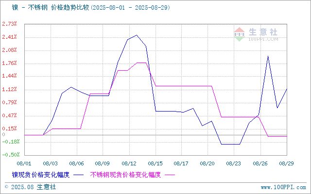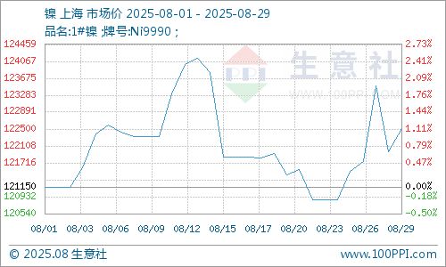 生意社08月29日讯 宏观预期与基本面疲软的博弈,8月,国内镍价格整体呈现震荡波动格局,价格先涨后跌、多次冲高回落,据生意社商品行情分析系统监测,8月29日,现货电解镍报122516元/吨,全月小幅上涨1.13%,但同比仍下跌6.97%。市场多空因素交织,宏观政策预期与流动性宽松提供支撑,而高库存和疲软的实际需求则限制价格上行空间。