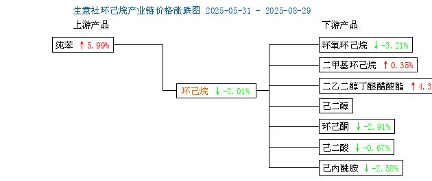 根据生意社监测的数据显示,截止8月29日,国内工业级优等品环己烷均价在7300元/吨,8月份环己烷价格大稳小动运行,价格相比上月同期上涨了0.46%,目前环己烷持货商报价坚挺,场内商谈气氛尚可,贸易商市场随行就市,下游市场按需采购为主。 二、行情分析 市场方面:8月份环己烷市场窄幅偏弱运行,价格波动范围不大,目前国内环己烷市场商谈重心持稳运行装置运行正常,现货供应充足,下游刚需采购为主,供应端利好支撑不明显,场内心态平稳,操作谨慎,观望态度尚存,目前整体市场商谈重心平稳,工厂出货无压力,利润尚可观,整体市场向上运行。 上游方面:8月份纯苯市场稳中偏弱运行,东营万达天弘纯苯报价下调90元/吨,执行5930元/吨,该厂约2万吨纯苯装置正常运行,齐成石化纯苯价格下调50元/吨,执行5980元/吨,东营万通石化纯苯今日报价下调80元/吨,执行5957元/吨。