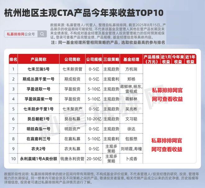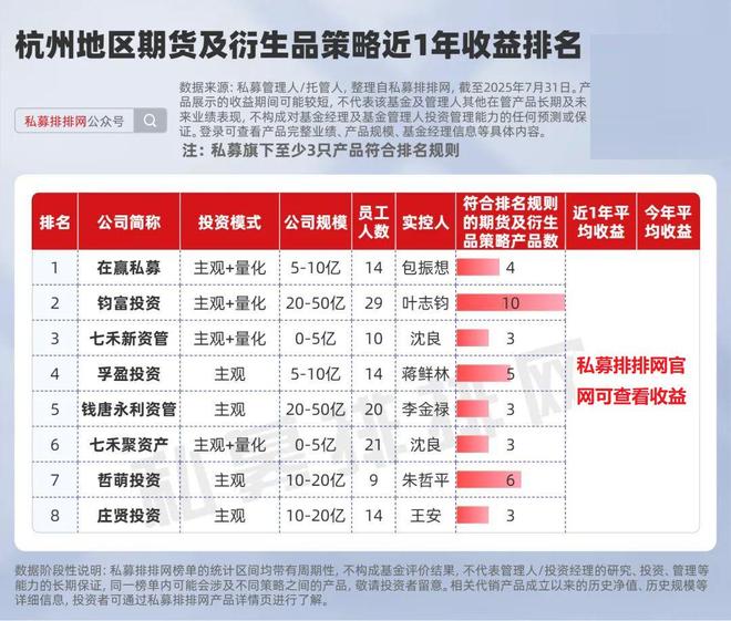 冠军产品“七禾兰瑞5号”由七禾新资管方杭瑞管理,近一月、今年来、近1年分别约为***%、***%、***%。方杭瑞为七禾新资管的投资总监、策略决策委员会委员,他于1998年开始股票交易,2008年上半年开始期货交易,具有20余年实战投资经验。 在赢、钧富近1年分夺冠亚军!钱唐永利位列第5 从公司角度来看,截至7月底,符合排名规则的产品数至少3只,且有近1年期货及衍生品策略业绩展示的杭州地区私募共有8家。从投资模式来看,前3名均为混合型(“主观+量化”)私募。从管理规模来看,钧富投资、钱塘永利资管的规模最大,均为20-50亿。