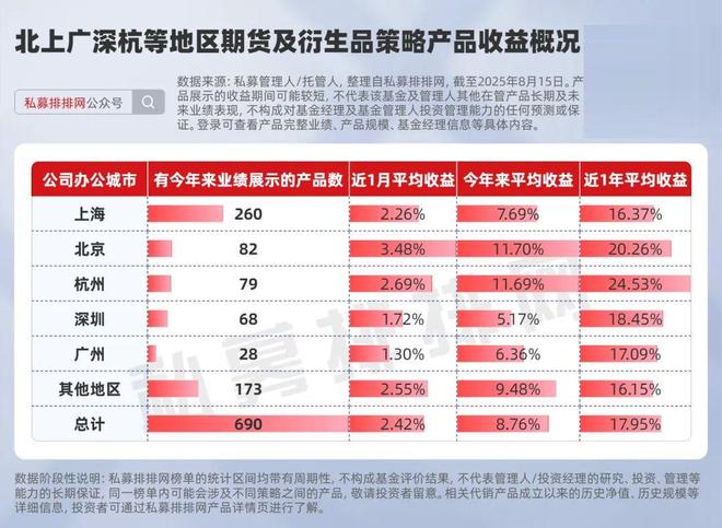 根据多家媒体的消息,7月底,杭州期货圈遭到“反内卷”行情的冲击,多家私募的主观CTA产品净值有较大回撤。 杭州期货圈以产业基本面分析见长,崛起于2015年后,如今已演化为“产业资本+私募基金+期货资管”三线并进的生态。其中,总部位于杭州的永安期货综合实力位列全国“第一梯队”,敦和资管、润洲私募、钱塘永利资管等知名私募基金的核心团队均脱胎于永安体系。 有市场分析认为,本次杭州期货圈亏损的主要原因在于其传统优势是获取“仓库-物流-产线”一线情报,但对政策节奏、情绪资金、量化资金行为反应稍显滞后。 从业绩数据来看,私募排排网数据显示,截至8月15日,今年来有业绩展示的期货及衍生品策略产品共有690只。按照产品所属私募的办公城市划分,杭州地区的产品数量位列第3,共有79只。其中,杭州地区期货及衍生品策略的今年来收益为11.69%,位列第2,近1月平均收益为2.69%。
