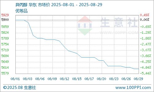 据生意社商品行情分析系统监测显示,8月异丙醇市场价格继续下跌。8月1日国内异丙醇均价为5900元/吨,8月29日均价为5608.33元/吨,与月初相比价格下调4.94%。 8月异丙醇市场价格继续下跌。上旬原料丙酮市场持续下行,影响异丙醇市场信心。下游市场需求乏力,库存增加,异丙醇市场价格下调。中旬异丙醇市场刚需为主,成交有限,市场继续下调。下旬,异丙醇市场交投清淡,场内商谈一般,市场价格下调。截止目前,山东地区异丙醇市场多数报价在5450-5500元/吨左右;江苏地区异丙醇市场多数报价在5650-5600元/吨左右。