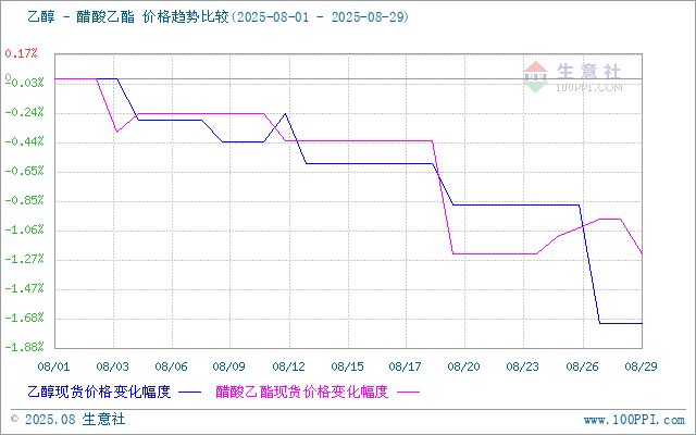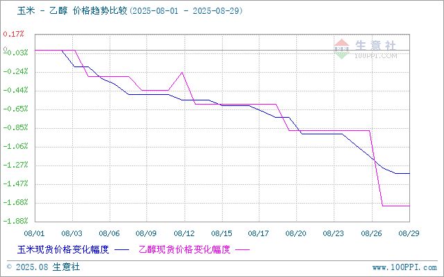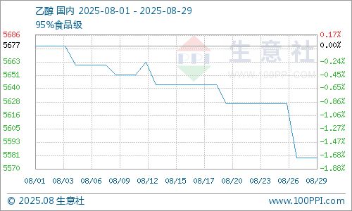 生意社08月29日讯 据生意社商品行情分析系统,整体供应增加;原料价格下跌,成本支撑不足。 供需矛盾凸显,白酒需求下降,化工刚需采购,8月国内乙醇市场行情震荡走低。8月1日至29日,国内乙醇生产商均价自5677元/吨窄幅下跌至5580元/吨,周期内价格跌幅1.71%,价格同比下跌6.34%。 月初,国内乙醇市场价格窄幅波动,成本面利好因素逐渐减弱,供应面地区间略有差异,供应量有增有减。 月上旬,国内乙醇市场价格偏弱运行,整体市场成交有限,工厂报价下降。 月中旬,国内乙醇市场价格偏弱运行,工厂出货心态积极,报价下调。 月下旬,国内乙醇市场价格偏弱整理,工厂报价下调,新单成交有限,工厂出货心态积极。 成本面,成本下降,原料玉米东北开秤价格较往年或有上涨,但存在或高开低走,河南玉米将集中上量从而影响河南地区玉米价格走势。乙醇成本面偏利空因素影响。