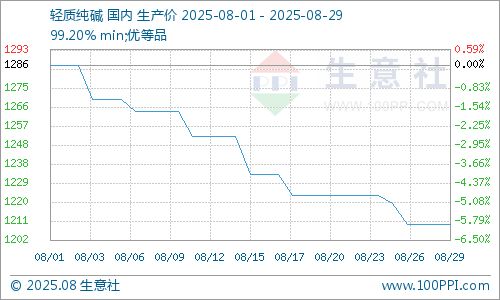 生意社08月29日讯 一、价格走势 据生意社商品分析系统显示,本周纯碱价格走势下调,截至8月29日纯碱市场均价在1210元/吨,与8月25日纯碱价格1220元/吨相比下调10元/吨,跌幅0.82%。