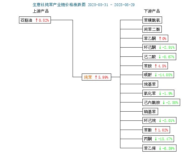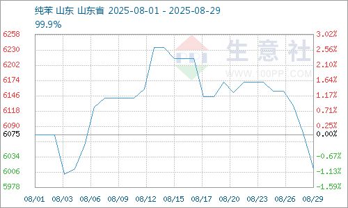 据生意社商品行情分析系统,本月山东地区纯苯市场价格先涨后跌。上半月市场价格上涨为主,下半月市场价格下跌为主。8月1日价格在6075.33元/吨;8月29日价格在6012元/吨,较月初上涨1.04%。 二、行情分析 纯苯:今日国内纯苯市场价格下跌。远月进口货持续冲击国内市场,期货交易悲观,低位买盘跟进纸货,市场信心不足。山东地炼企业报价下调,场内成交一般。整体来看,刚需采购意愿不足,预计短期内纯苯震荡整理,实际成交一单一议。 本月中石化纯苯价格下调50元/吨至6000元/吨。 下游方面