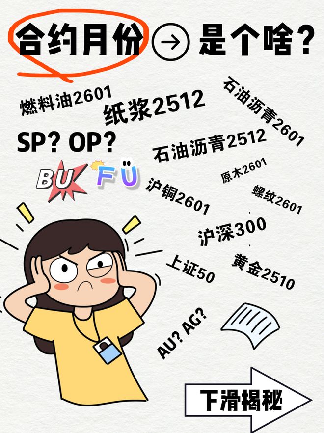 案例介绍: 胶版印刷纸期货OP2601 OP2601,看似简约的命名其实隐含着三个信息,分别是期货品种、年份、到期月份。其中开头的大写字母OP代表的是合约的品种名称,取自于胶版印刷纸英文名称offset paper两个单词首字母,26代表的是2026年,01代表的是一月份,所以OP2601表示为:2026年1月到期交割的胶版印刷纸期货。 知识延伸 我国境内期货合约命名,金属期货合约代码以元素符号命名,如铜期货为CU、锌为ZN。其余商品期货合约命名为标的物英文单词的头两个字母、首尾字母组成,或由两个英文单词组各取一个字母构成代码,如苹果(apple)期货合约代码为AP,白糖(suger)期货合约代码为SR,棉花期货(Cotton Futures)合约代码为CF。 那么其他期货品种的合约是怎么样的呢? 来看看吧~~