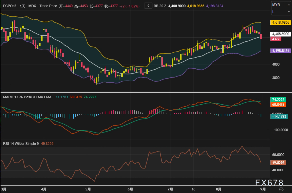 周五(8月29日),马来西亚衍生品交易所(Bursa Malaysia Derivatives Exchange)棕榈油主力合约FCPOc3收于4377林吉特/吨,单日下跌1.62%,周线累计跌幅达3.36%,终结了此前连续三周的上涨态势。盘中价格波动剧烈,技术指标显示RSI(14)已升至94.83,远超超买警戒线,而MACD柱状图呈现负值(-14.18),暗示短期动能转弱。 ![]() 本周棕榈油的回调主要受外围市场拖累。芝加哥期货交易所(CBOT)豆油价格单日下跌1.05%,大连商品交易所豆油合约(DBYcv1)和棕榈油合约(DCPcv1)分别下跌0.38%和1.69%。由于棕榈油与豆油、菜籽油等竞争性油脂存在高度价格联动,外围市场的走弱直接压制了棕榈油多头情绪。此外,马来西亚交易所因公共假日将于下周一的休市,促使部分交易者提前平仓以规避风险。 一名吉隆坡交易员指出:“假期前的仓位调整和竞争油脂的夜间下跌形成了双重压力。市场流动性在长周末前通常趋于谨慎。” 生物柴油需求与货币因素的多空交织 原油价格本周虽录得上涨,但近期走势震荡。夏季驾驶旺季结束预期压制需求前景,而俄罗斯供应不确定性仍存。原油走弱降低了棕榈油作为生物柴油原料的经济吸引力,对价格构成间接压力。另一方面,林吉特兑美元汇率当日贬值0.19%,理论上提升了棕榈油对外币持有者的购买性价比,但这一利好未能抵消市场整体的空头情绪。 技术面超买信号凸显,短期回调压力显著 从技术分析角度看,当前棕榈油价格已突破布林带上轨(4618.99林吉特),而RSI指标高达94.83,表明市场处于极端超买状态。MACD快慢线虽仍位于零轴上方,但柱状图转负,暗示上涨动能衰竭。一名技术分析师认为:“若价格未能守住布林中轨(4408.9林吉特)支撑,可能进一步下探4198林吉特区间。” 机构观点:短期谨慎,长期供需格局未变 多家知名机构对后市持分化观点。一部分分析师认为,尽管短期技术面存在回调需求,但东南亚产区季节性增产周期接近尾声,且库存水平仍低于历史均值,中长期供需结构并未转向宽松。另一派观点则强调,竞争性油脂的供应压力(尤其是南美大豆出口节奏加快)可能持续抑制棕榈油上行空间。一名资深油脂分析师表示:“市场需要消化近期涨幅,但下行空间受限于产地挺价意愿和生物柴油政策的潜在支撑。” 结论:关注关键支撑与外围市场联动 棕榈油市场正处于多空因素博弈的关键节点。短期需重点关注布林中轨支撑有效性及外围油脂市场情绪变化。若原油价格反弹或林吉特延续贬值,可能为价格提供阶段性支撑。然而,技术面超买修复需求强烈,交易者需警惕波动率放大风险。中长期而言,产地政策与全球植物油供需平衡表仍是决定方向的核心变量。 ![]() |
