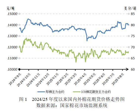 8月份,美国关税政策暂时明朗,外贸环境步入稳定阶段,美联储降息预期升温,为大宗商品市场价格积蓄上行动力。美国农业部下调产量并未改变国际棉花市场宽松格局,与此同时,年度末期国内棉花市场延续紧平衡态势,棉花价格呈现内强外弱的特征,内外棉价差攀升至本年度最高水平。 第一部分 行情回顾 国际市场方面,8月初,随着美国对多国新对等关税税率生效,对全球纺织需求形成压制,导致国际棉价下跌;随后,中美就关税暂缓期延长90天于8月12日达成共识,美国农业部下调新年度全球棉花产量39万吨,全球供应收紧预期升温,印度政府先后宣布并延长免除棉花进口关税等至12月31日,国际棉花价格先跌后涨。截至8月28日,ICE棉花期货主力合约结算价67.3美分/磅,较上月末上涨0.05美分/磅,涨幅0.07%;代表进口棉中国主港到岸均价的国际棉花指数(M)74.24美分/磅,折人民币进口成本12888元/吨(1%关税,不含港杂费),较上月下跌183元/吨,跌幅1.40%。 国内市场方面,在中美关税暂缓期延长90天、国内陈棉供应减少、新棉预售规模增加、纺织市场旺季临近等多重利好因素推动下,国内棉价偏强震荡。截至8月28日,郑州商品交易所棉花期货主力合约结算价14070元/吨,较上月末上涨370元/吨,涨幅2.70%;代表内地标准级皮棉市场价格的国家棉花价格B指数15237元/吨,较上月下跌34元/吨,跌幅0.22%。内外价差持续扩大,由上月末2200元/吨扩大到本月最高2349元/吨。