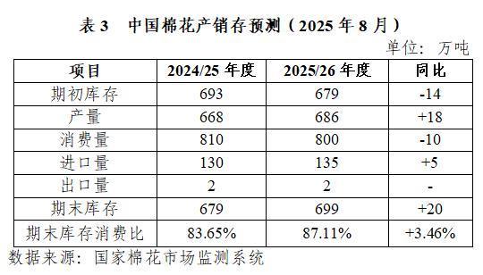2.主要国家棉花供应形势 南半球棉花收获收尾。巴西新棉收获进度偏慢,据巴西棉农协会数据,截至8月中旬,巴西新棉收获完成47%,加工完成15%,棉农销售完成68%,主产区的收获进度远低于去年和往年同期。澳大利亚棉花收获已经结束,据澳大利亚棉商协会数据,截至8月上旬,加工进度为75%、预计将于10月初完成,检验完成65%,出口预计趋于正常。总体看,南半球供应进度可能略有后延,丰产态势并未改变。 北半球棉花长势总体良好。美棉生长进度偏慢,棉花长势良好,据美国农业部数据,截至8月24日,美棉吐絮率为20%,较去年同期减少4个百分点,美棉长势达到良好以上的占54%,较去年同期增加14个百分点。印度棉花种植面积缩减3%左右,棉花长势良好促进单产提高,美国农业参赞预计印度棉产量同比降幅在2%左右。巴基斯坦新棉上市量同比锐减,其轧棉厂协会数据显示,截至8月15日,巴基斯坦棉花到货量降至15万吨左右,同比降幅17.5%。总体看,北半球棉花长势总体良好,部分国家供应进度偏慢。 3.全球纺织消费形势 美国新一轮关税政策冲击全球纺织供应链。自对等关税实施以来,美国进口成本大幅增加,对美国消费及进口的负面影响将逐步显现,全球纺织品服装贸易和消费面临走弱风险。近日在美国拉斯维加斯举行的秋季服装鞋帽订货会上,多家参会企业代表表示,美国关税政策让全球时尚及服装鞋帽行业面临利润压缩及供应链不确定性等压力,整个行业感到“紧张与焦虑”。加拿大女装品牌特里巴尔时装公司表示,已将2026年春季系列女装价格上调约7%。据国际纺联最新调查,全球纺织业经营状况呈现负面,企业对未来六个月的商业预期维持下降态势。总体看,美国新一轮关税政策对印度加征税率达到50%,对越南、孟加拉、巴基斯坦等国家纺织品服装出口国分别加征20%左右税率,近期印度出口商表示很多美国客户取消订单,对东南亚国家接单情况影响相对有限。 二、国内棉花市场 (一)宏观环境 会议定调政策支持力度,国内经济增长动能有望持续释放。7月底,中央政治局召开会议,提出宏观政策要持续发力、适时加力,加快政府债券发行使用,提高资金使用效率,落实落细更加积极的财政政策;会议还强调要有效释放内需潜力,深入实施提振消费专项行动,培育服务消费新的增长点。同期,国际货币基金组织将2025年我国GDP增速提高至4.8%,较4月的预期上调0.8个百分点,体现国际社会对我国经济发展的信心持续增强。8月中旬,国务院新闻办发布会介绍,下阶段,尽管经济运行中依然面临不少风险挑战,但我国经济基础稳、优势多、韧性强、潜能大,长期向好的支撑条件和基本趋势没有变,宏观政策发力显效,各方面积极作为,市场需求扩大,新质生产力发展,市场活力提升,将为经济平稳运行与发展质量稳步提升提供有力支撑。 (二)国内棉花供需形势 1.本年度棉花供应趋紧,新年度丰产概率较大 据国家棉花市场监测系统数据,截至8月21日,2024/25年度国内棉花销售率为98.1%,同比提高5.3个百分点,较过去四年均值提高7.9个百分点。万得数据显示,7月末全国棉花商业库存降至182万吨,其中内地库61万吨,处于近七年最低水平。截至7月,2024/25年度我国棉花进口量98.0万吨,同比减少210.6万吨;棉纱进口量128.8万吨,同比减少27.8万吨。近期国家增发的20万吨棉花滑准税配额仅限于加工贸易使用,此次要求企业凭合同申领,并在签发之日2个月内有效,业内预计将略有缓解当前供应偏紧局面,新棉上市前市场供应仍然维持紧平衡格局。 当前新疆主产棉区天气总体正常,棉花陆续裂铃吐絮,籽棉亩产呈增长态势,丰产预期进一步增强,收获时间预计提前一周左右至9月下旬,部分轧花厂按基差定价方式预售新棉。本期中国棉花产销存预测平衡表未做调整。