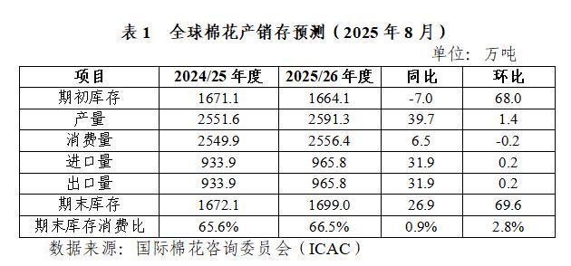 第二部分 分析与展望 一、国际棉花市场 (一)宏观环境 美国关税政策暂时明朗,美联储降息预期全面升温。8月7日美国对多个国家加征新对等关税税率生效,8月12日中美就关税暂缓期延长90天达成共识,利于促进美国商家自中国预备秋冬及节日订单,在一定程度上对冲了贸易前景的不确定性。短期来看,美国调整关税政策的风险阶段性落地,对大宗商品市场的影响暂处平静状态。与此同时,美国经济数据与美联储表态进一步强化了降息预期。8月公布的数据显示,美国失业率上升至4.2%,通胀指标CPI同比增长2.7%降至年内最低,为货币政策调整提供了空间。美联储主席鲍威尔在近期召开的全球央行年会上表示“基于前景和风险平衡的变化,政策立场可能需要调整。”市场对9月降息预期急剧升温,“美联储观察”工具显示,9月降息25个基点的概率升至91.1%。 (二)全球棉花供需形势 1.2025/26年度全球棉花供需形势维持宽松 据国际棉花咨询委员会8月数据,2025/26年度全球棉花产量为2591.3万吨,同比增加39.7万吨,环比增加1.4万吨;消费量为2556.4万吨,同比增加6.5万吨,环比减少0.2万吨。总体上看2025/26年度全球棉花供需形势依然较为宽松,产量大于消费量34.9万吨。