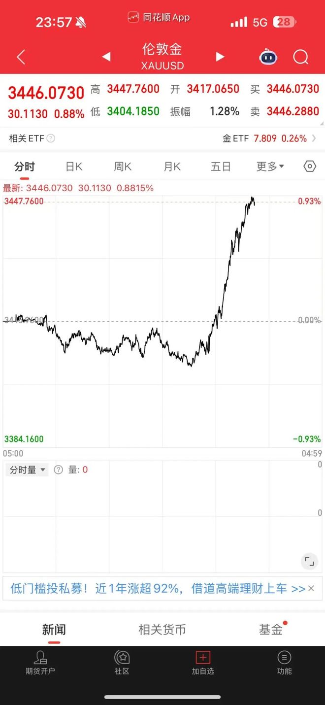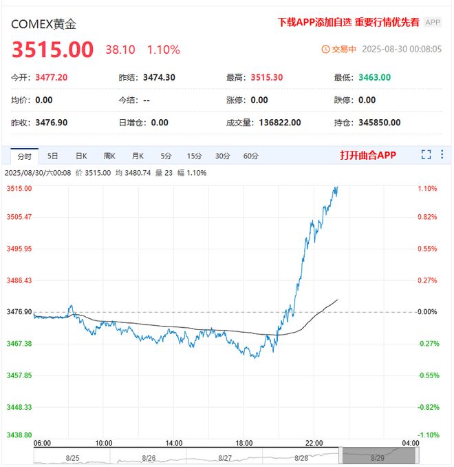 点击上图查看详情 黄金,突然飙涨! 8月29日晚间,伦敦金现向上拉升,迅速突破3430美元/盎司关口,目前价格为3446美元/盎司,盘中涨幅超0.88%。