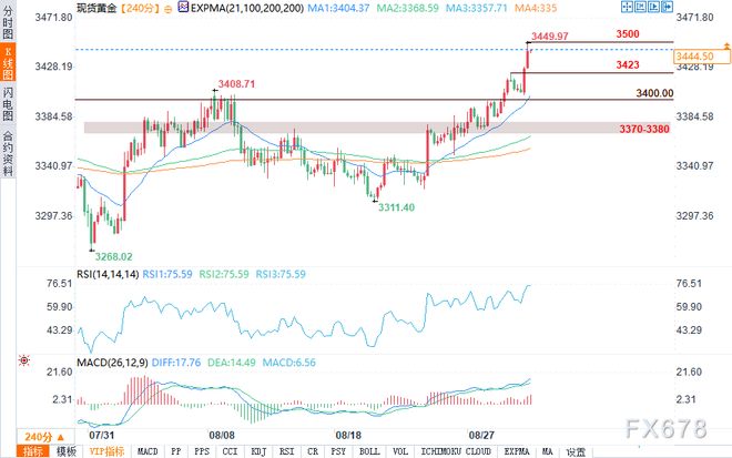 在避险资金流动、美联储政策预期以及持续的地缘政治与经济不确定性支撑下,黄金本月有望实现稳健涨幅。对美联储独立性的担忧进一步提升了黄金的吸引力,在整体看涨趋势中,短期回调很可能被视为逢低买入的机会。 美国经济分析局的数据显示,7月核心个人消费支出价格指数环比上涨0.3%,符合市场预期,且与6月增速持平;同比来看,核心通胀率从2.8%微升至2.9%,创下2月以来的最高水平。整体个人消费支出环比上涨0.2%,符合预期,但略低于6月的0.3%,同比增速则稳定在2.6%。 美国7月个人支出环比增长0.5%,高于0.3%的预期,也快于6月0.3%的增幅;个人收入环比增长0.4%,符合普遍预期,且高于前值0.3%。这一数据进一步证明,尽管劳动力市场显现疲软迹象,但家庭消费依然保持韧性。 High Ridge Futures金属交易主管David Meger说:"我们预期美联储今年全年将降息一次,或可能是两次,(这)总体上对包括黄金和白银在内的大宗商品价格起到支撑作用。" 交易商将美联储在9月政策会议上降息25个基点的可能性从数据公布前的85%提高到89%。 技术分析:黄金在3400美元上方盘整,PCE报告成下一个催化剂