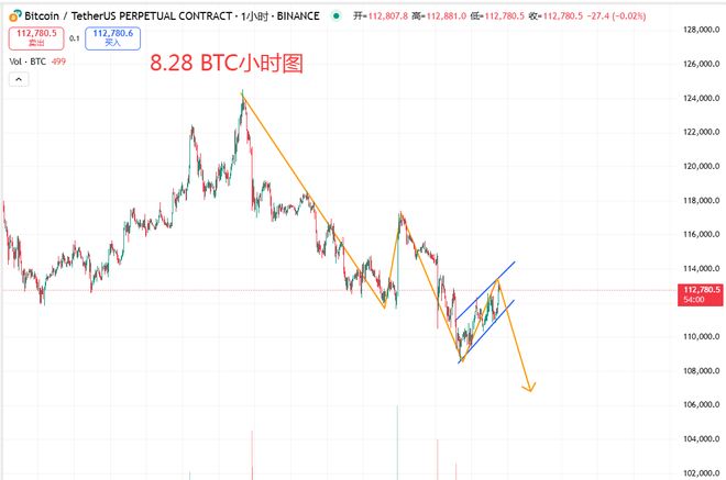 下午好,市场最终还是迎来了大跌,昨天提到113500附近可以尝试中线空,坚持还是带来了收获。在价格跌破112000后,周线附图指标背离向下,就非常明确的表示,市场框架已经改变,非常符合趋势转折123法则,也可以简单看成M顶112000就是颈线,前高假突破后放量吞没下跌, 前期的加息消息仅仅带来短暂的反弹,需求严重不足的表现 在这种背景下,短中期没有任何理由再去看涨,所以近期坚定看空,并且注意9月的大回调的风险,理论结构上下跌的目标在100000附近,当然不是说直接跌到100000,期间会跌跌涨跌,缓慢跌至10万附近,呈现一个震荡下跌的结构,若想出现较大反弹,市场需要在连续弱势下跌后放量快速下探一波,才可能迎来一波不错的反弹