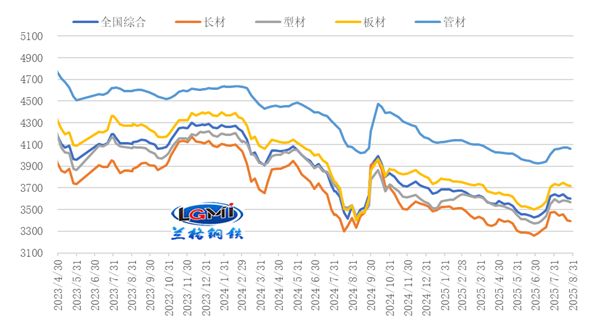 2025年8月份,在行业“反内卷”预期减弱、焦煤焦炭市场情绪转换、阅兵供给端限产预期、焦炭市场三轮提涨落地、成本支撑继续增强的带动下,国内钢铁市场呈现先扬后抑的行情。据兰格钢铁网监测数据显示,截至8月底,兰格钢铁全国钢材综合价格为3593元/吨,较上月同期下跌58元/吨,环比跌幅为1.6%,年同比上涨2.0%。从月度均值来看,8月份,兰格钢铁全国钢材综合价格均值为3620元/吨,较上月上涨86元/吨,涨幅为2.4%。