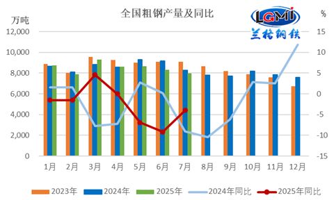 图1 兰格钢材绝对价格指数走势(元/吨) 展望9月份,国内钢铁市场仍受到多重因素影响,美联储降息或将落地,中美关税谈判重启,建筑钢材市场需求将有好转,钢材社会库存或将见顶回落,供应端维持相对低位,市场供需关系有改善预期,成本支撑明显增强。但仍需关注宏观政策落地效果及需求兑现程度,以及国际贸易争端及关税政策变化,所带来的钢材出口回落压力及市场情绪改变对市场的制约。兰格钢铁大数据AI辅助决策系统预测,预计2025年9月份国内钢铁市场或将呈现区间震荡的运行态势,均价与上月相比小幅波动。 9月份国内钢材市场价格走势的有利因素主要有以下几个方面: 一是,国内经济保持稳中有进发展态势 2025年下半年以来,我国加紧实施更加积极有为的宏观政策,纵深推进全国统一大市场建设,国民经济保持稳中有进发展态势,生产需求持续增长,就业物价总体稳定,新质生产力培育壮大,高质量发展取得新成效。国家统计局数据显示,2025年1-7月,驱动经济增长的“三驾马车”中,社零消费累计同比增长4.8%,增速较1-6月回落0.2个百分点;出口总额累计同比增长6.1%,增速较1-6月回升0.2个百分点;固定资产投资累计增幅为1.6%,增速较1-6月回落1.2个百分点。兰格钢铁智策宏观经济预测数据显示,后期“三驾马车”仍延续增长态势,预计8月社零消费当月同比增长3.6%,固定资产投资累计同比增长1.8%,出口总额当月同比增长5.4%。 国家扩大内需政策继续推进。8月12日,财政部、中国人民银行、金融监管总局印发《个人消费贷款财政贴息政策实施方案》。8月18日,国务院总理李强主持召开国务院第九次全体会议,强调要进一步提升宏观政策实施效能,深入评估政策实施情况,及时回应市场关切,稳定市场预期。要抓住关键着力点做强国内大循环。持续激发消费潜力,系统清理消费领域限制性措施,加快培育壮大服务消费、新型消费等新增长点。加力扩大有效投资,发挥重大工程引领带动作用,适应需求变化更多“投资于人”、服务于民生,积极促进民间投资。纵深推进全国统一大市场建设,不断释放超大规模市场红利。采取有力措施巩固房地产市场止跌回稳态势。 下阶段,我国仍将坚持稳中求进工作总基调,完整准确全面贯彻新发展理念,加快构建新发展格局,全面贯彻落实党中央、国务院决策部署,推动各项政策落实落细,着力稳就业、稳企业、稳市场、稳预期,有效释放内需潜力,有力促进国内国际双循环,推动经济平稳健康发展。 二是,钢铁产量低位运行 2025年7月份,尽管国内钢铁市场呈现了淡季不淡的行情,但受需求疲软制约,钢厂产能释放力度继续减弱。据国家统计局发布数据显示,7月份,全国生铁产量7080万吨,同比下降1.4%,同比降速收窄2.7个百分点;全国粗钢产量7966万吨,同比下降4.0%,同比降速收窄5.2个百分点(详见图2)。累计产量来看,1-7月份,全国生铁累计产量50583万吨,同比下降1.3%;粗钢累计产量59447万吨,同比下降3.1%。