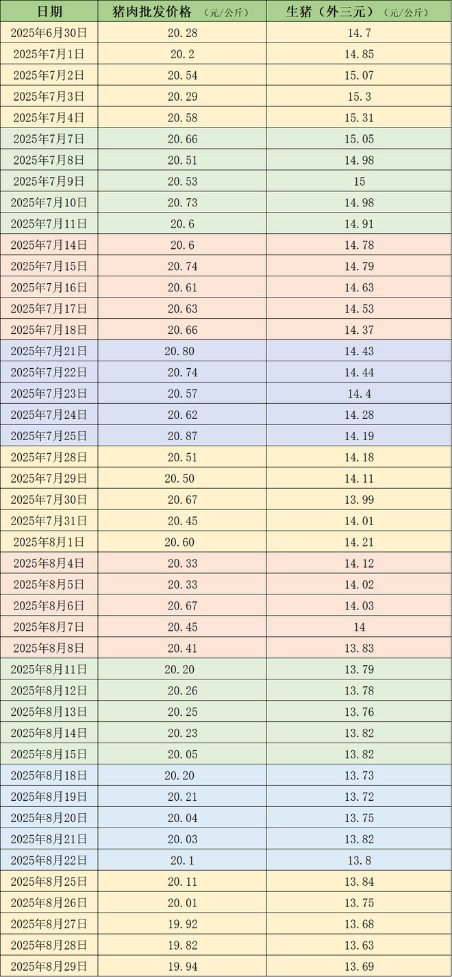 据农业农村部监测,8月29日,全国农产品批发市场猪肉平均价格为19.94元/公斤,与上周五(8月22日)的20.10元/公斤相比,下降0.8%。本周的平均价格为19.96元/公斤,与上周20.12元/公斤的均价相比,下降0.8%。 本周国内生猪价格呈下行走势,周均价环比下跌。从生猪周均价来看,已连续8周下跌。据中国养猪网的数据,8月29日,生猪(外三元)价格为13.69元/公斤,与上周五(8月22日)的13.8元/公斤相比,下降0.8%。从一周均价来看,本周生猪均价为13.72元/公斤,与上周13.76元/公斤的均价相比,下降0.3%。