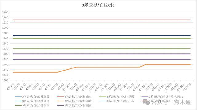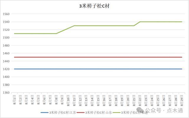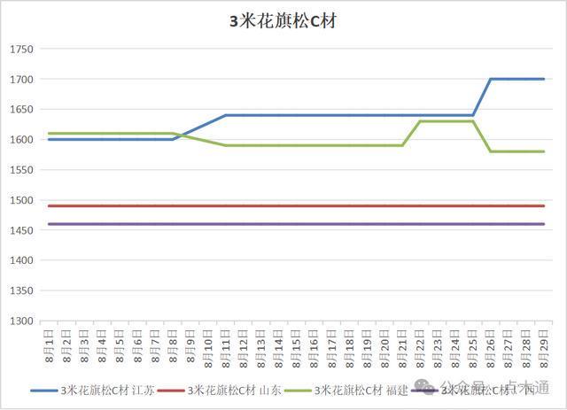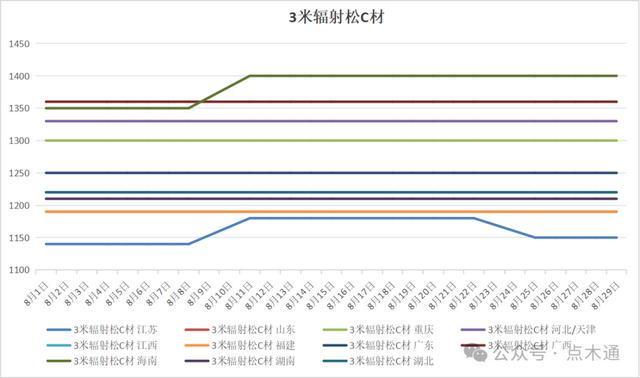 时光匆匆,八月悄然落幕。在这个月里,木材市场行情备受关注,不同种类木材价格走势分化明显,有的小幅上扬,有的稳如磐石,也有的略有下跌。抓住八月的尾巴,就让我们一起来盘点一下各类木材的价格变化。特别说明:文内所讨论的价格变化全部选用的是3米C材价格波动情况,其他规格等级可作为参照对比。 八月辐射松变动详情