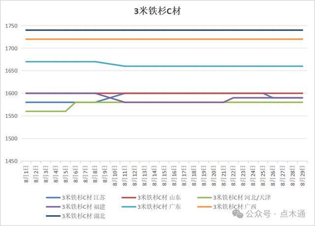 【价格上涨地区】 福建地区白松/云杉价格月初为1530元/立方,月末为1560元/立方,价格累计上涨了30元/立方。 【价格持平地区】 江苏地区白松/云杉价格始终保持在1580元/立方,未发生变化。 山东地区白松/云杉价格始终保持在1600元/立方,未发生变化。 重庆地区白松/云杉价格始终保持在1660元/立方,未发生变化。 河北/天津白松/云杉价格始终保持在1580元/立方,未发生变化。 江西地区白松/云杉价格始终保持在1670元/立方,未发生变化。 广东地区白松/云杉价格始终保持在1670元/立方,未发生变化。 广西地区白松/云杉价格始终保持在1730元/立方,未发生变化。 海南地区白松/云杉价格始终保持在1620元/立方,未发生变化。 湖南地区白松/云杉价格始终保持在1600元/立方,未发生变化。 本月白松/云杉价格整体平稳,仅福建地区在中旬和下旬各调整了一次,累计涨幅仅30元/立方,其余地区价格则延续平稳走势,未出现波动。 八月铁杉变动详情