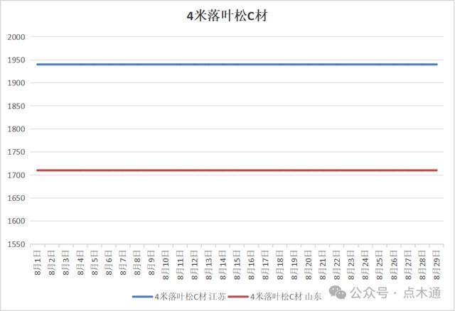 【价格上涨地区】 福建地区樟子松价格月初为1510元/立方,月末为1540元/立方,价格累计上涨了30元/立方。 【价格持平地区】 江苏地区樟子松价格始终保持在1420元/立方,未发生变化。 山东地区樟子松价格始终保持在1450元/立方,未发生变化。 本月樟子松价格市场整体表现较为平稳,地区间差异较小,仅福建微涨30元/立方,山东和江苏地区樟子松价格则波澜不惊,始终维持原状,未出现任何价格波动。 八月落叶松变动详情