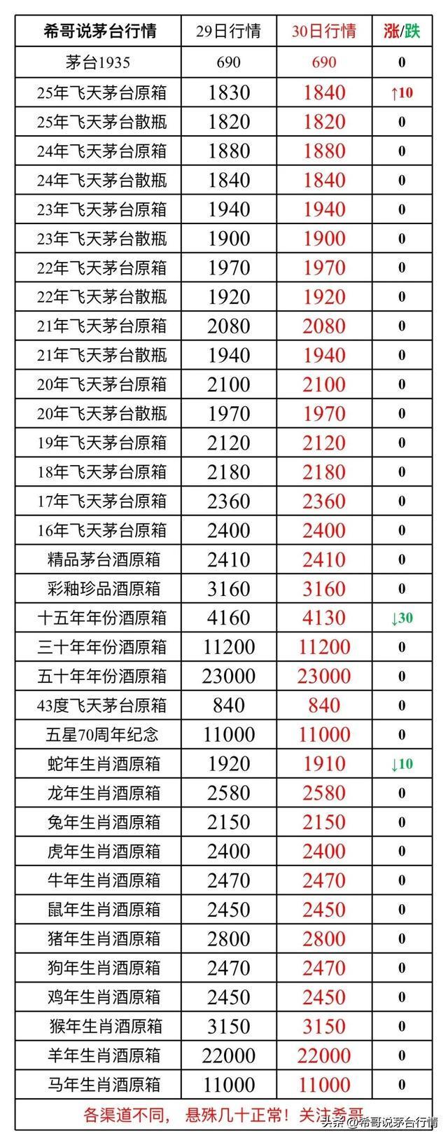 2023年11月1日起,53度500ml贵州茅台酒出厂价上调约20%,调整后出厂价达1169元/瓶,厂家建议零售价1499元/瓶。由于供需失衡,市场实际成交价普遍高于指导价。 8月30日最新行情显示:25年飞天茅台原箱价格呈现"V型反弹",从29日的1830元回升至1840元,单日涨幅10元。十五年年份酒原箱结束长期横盘(8月1-29日稳定在4160元),30日突降30元至4130元。蛇年生肖酒原箱延续震荡下行趋势,继23日跌至1920元后,30日再降10元至1910元,较8月20日高点1960元累计下跌50元。 价格波动背后,25年飞天茅台原箱本月呈现"高开低走再反弹"走势:月初1900元→中旬最低1845元→月末1840元。需注意不同渠道价差可达数十元,消费者选购时建议多方比价。 (数据来源:希哥说茅台行情) |